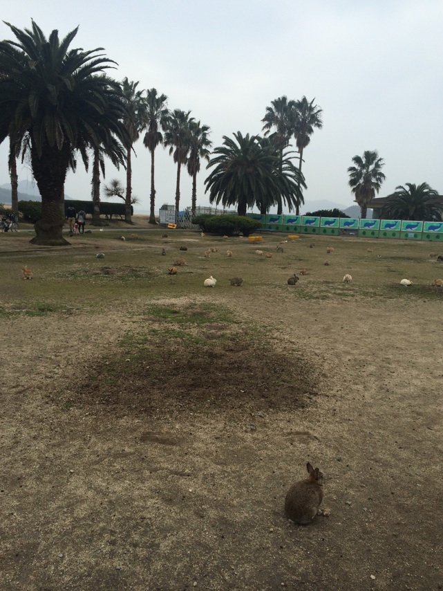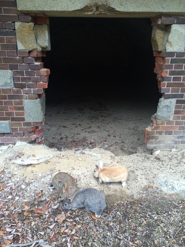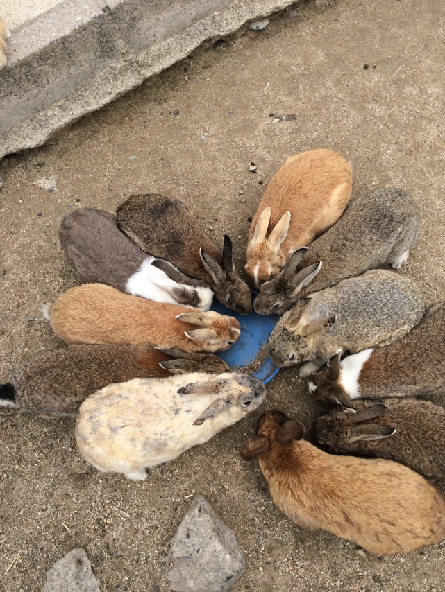 未だ少し寝ぼけ頭のままチェックアウトし、また島を1周することにした。昨日は島の半分まで行って山を登って(つまり島の真ん中を突っ切る形で)宿泊施設まで戻ったので今度こそ島の外周を回りたかったのだ。有料で電動自転車を借りる。電動自転車乗るの初めてだ。軽く漕ぐとギアを変えたみたいにペダルが軽くなる。あれはすごいね。そしてこちらが自転車に乗っていてもなにためらうことなくまっすぐ向かってくるうさぎたち。轢く! やめろ! 来るんじゃない! 慣れているのかきれいに避けていくけれど乗っているこちらは本当に怖い。特に自転車を停めたときはすごい。奴らの頭の中では「人間が自転車から降りる=間違いなく餌をくれる」となっているらしく、普通に歩いていたときよりも集まってくるのが早い。そしてみるみるうちに囲まれる。気分は悪くないどころかサイコーだ。発電所跡の廃墟はすごかった。THE 廃墟といった感じの廃墟で気分がよかった。そしてそういうところは人間が長く留まることを知っているのか他のところよりもうさぎの数が多かった。それから海! 岐阜県民は海を知らないので海を見ると「すごい…これが図鑑で見た海…初めて見た…」と言う。また施設まで戻ってきて、名残惜しいが島を出る。とてもいい島だった。また行きたい。